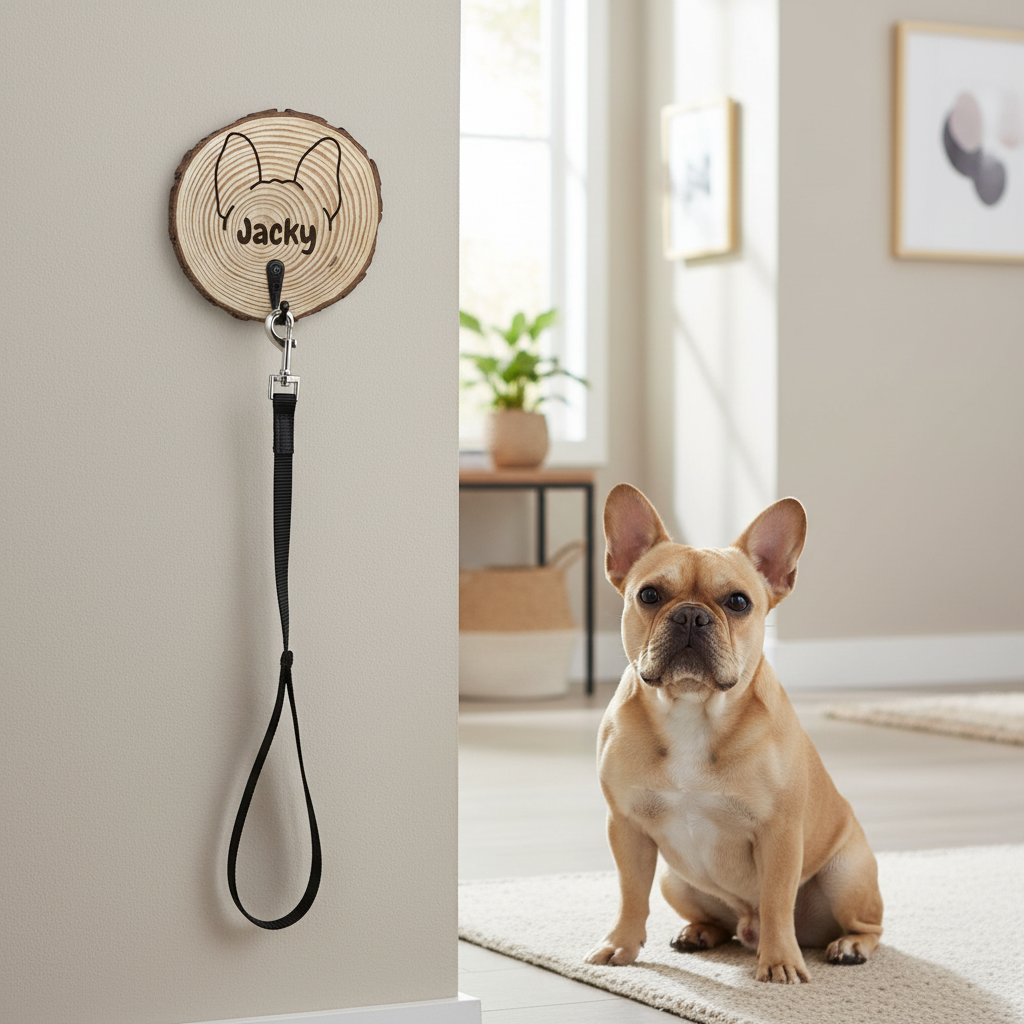 Individueller Hundeleinen-Halter aus echter Holzscheibe – personalisiert mit Namen, Pfoten und Hundeohren