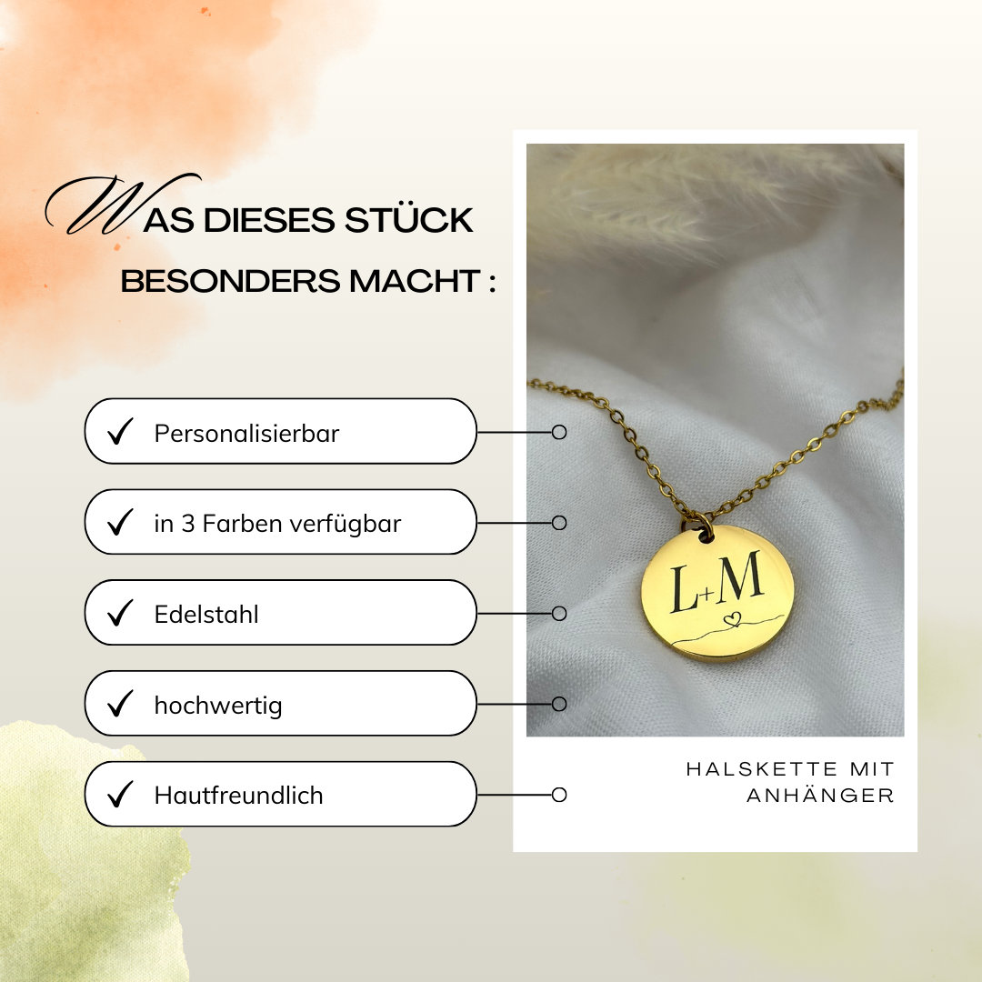 Die Halskette besteht aus hochwertigem Edelstahl 304. Sie ist robust, langlebig und hautfreundlich. Der runde Anhänger bietet genug Platz für eine individuelle Gravur und eignet sich ideal als Geschenk oder als persönliches Erinnerungsstück.